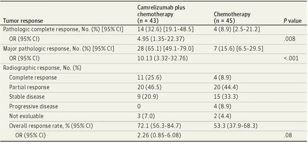 北京时间8月3日,asiagame医药创新药卡瑞利珠单抗联合化疗(Cam+CT)对比化疗(CT)新辅助治疗ⅢA/ⅢB (T3N2) 期非小细胞肺癌(NSCLC)结果在线发表于国际权威期刊JAMA Oncology[1]。该研究是由空军军医大学唐都医院姜涛教授、雷杰教授团队联合陕西省肿瘤医院雷光焰教授团队、兰州大学第二附属医院王成教授团队共同参与的一项随机对照、多中心、Ⅱ期临床研究(TD-FOREKNOW,NCT04338620)。研究结果显示,与化疗相比,卡瑞利珠单抗联合化疗新辅助治疗NSCLC显著提高了病理完全缓解(pCR)率(32.6% vs 8.9%,OR=4.95,95% CI :1.35-22.37, P =0 .008),且安全性良好。本研究是卡瑞利珠单抗新辅助治疗可切除NSCLC患者的首个随机对照研究,为NSCLC新辅助免疫治疗再添新证。
